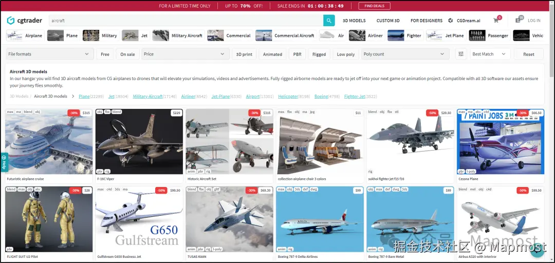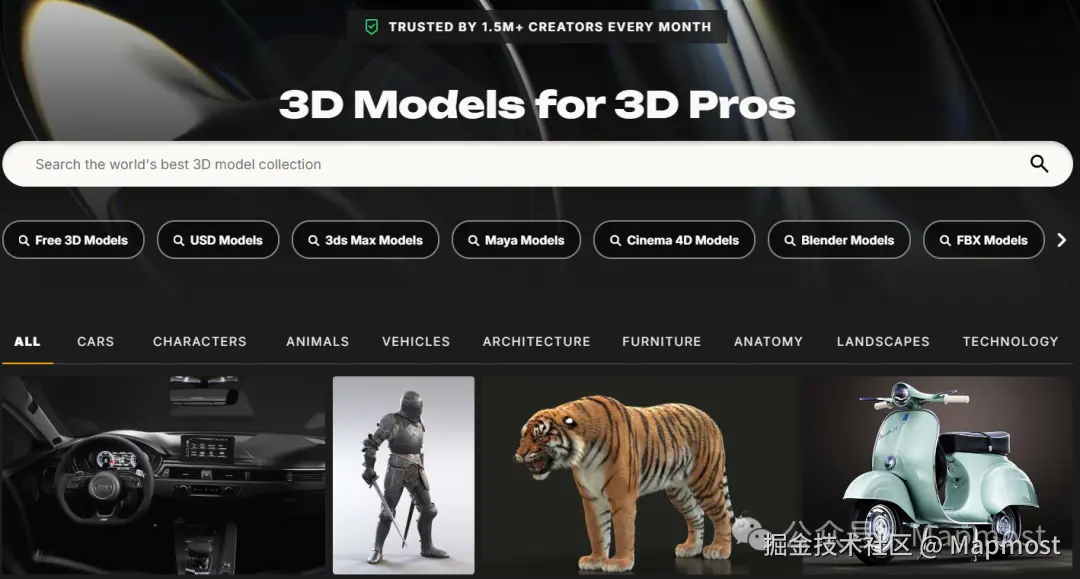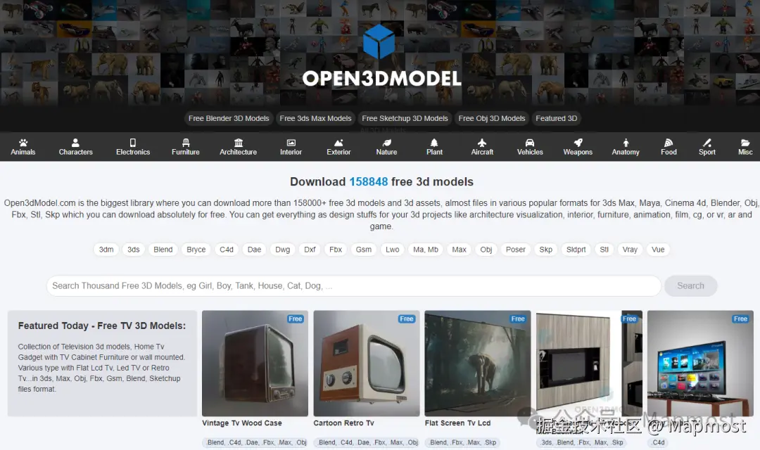 Turbosquid号称专业人士的3D模型。素材种类丰富,提供了大量免费DCC软件模型,支持下载格式选择。