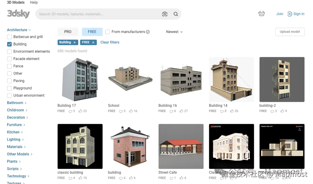 3dsky拥有较多免费资产,美中不足的是每天只能下载3个,格式包含了:.obj、.fbx、.max,可以根据需求进行下载。网页指路:3dsky.org 3dsky
