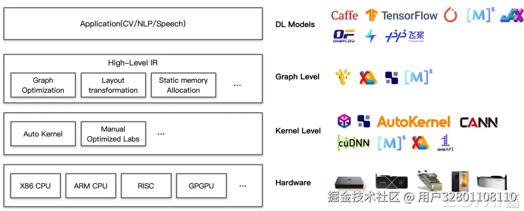 硬件接口抽象:GPU、NPU、TPU、CPU、FPGA 和 ASIC 等硬件的接口抽象。统一的硬件接口抽象可以复用编译优化策略,让优化方案与具体底层的 AI 硬件设备和 AI 体系结构适当解耦。
