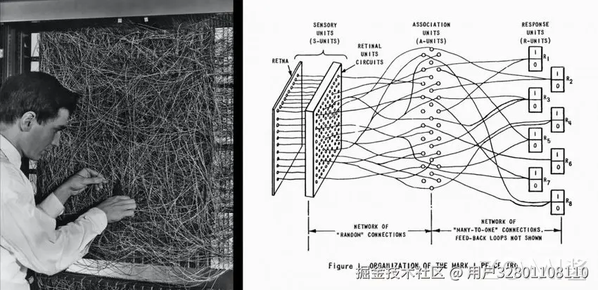 1957 年,Frank Rosenblat 发明感知机(Perceptron)[[4]]。奠定了之后 AI 的基本结构,其计算以矩阵乘加运算为主,进而影响了后续人工智能芯片和系统的基本算子类型,例如:英伟达的新款 GPU 就有为矩阵计算设计的专用张量核(Tensor Core)。