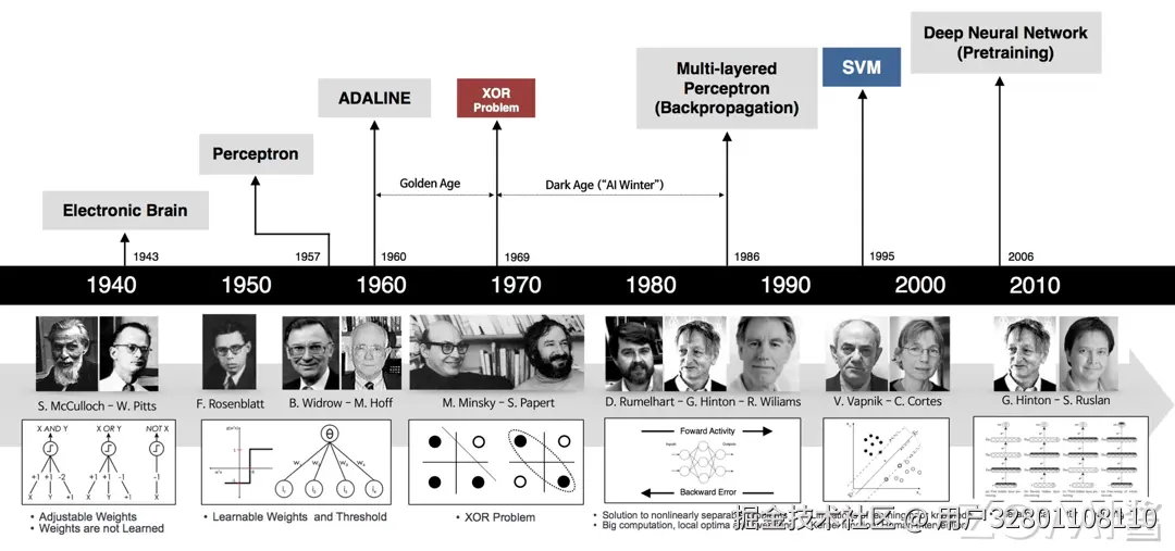 虽然 AI 在今年取得了举世瞩目的进展与突破,但是其当前基于的核心理论神经网络等,在这波浪潮开始前已经基本奠定,并经历了多次的起起伏伏。神经网络作为 AI 的前身,经历了以下的发展阶段: