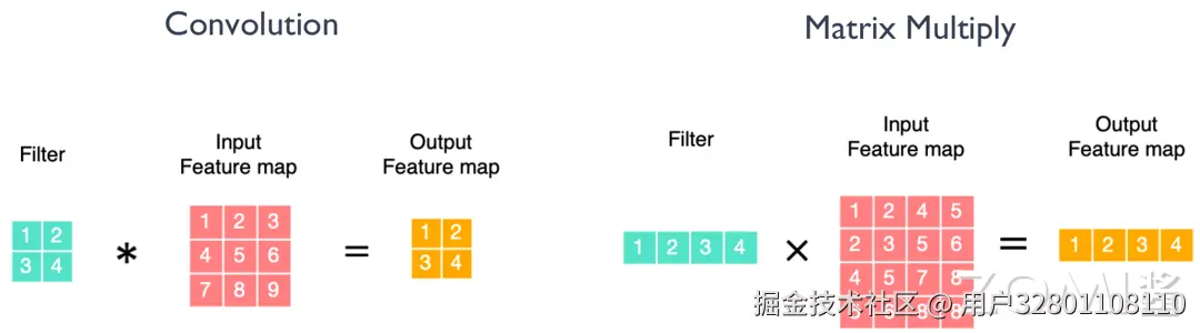 其中逐元素相乘,再累加的过程就是上节提到的一个计算单位:MACs,矩阵乘的 MACs 数对最终性能具有重要影响。通过将输入数据(Feature Map)和卷积核数据进行重排,卷积操作本质上可以等效理解为矩阵乘操作。