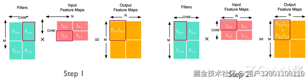 假设用 CHW 表示上面转换公式中的 的值,M 表示 OC,N 表示 ,矩阵乘的输入特征图维度是 (CHW, N),矩阵乘的卷积核维度是(M, CHW),输出矩阵维度是(M, N),可以同时在 M,N,CHW 三个维度进行 Tiling,每次计算过程分别加载一小块的特征图和卷积核数据计算,比如在 M,N,CHW 三个维度各分了 2 小块,得到完成的输出特征图需要进行 8 次的数据加载和计算。下图中的 Step1, Step2 展示了两次数据加载可以完成一个输出 Tile 块的计算过程。