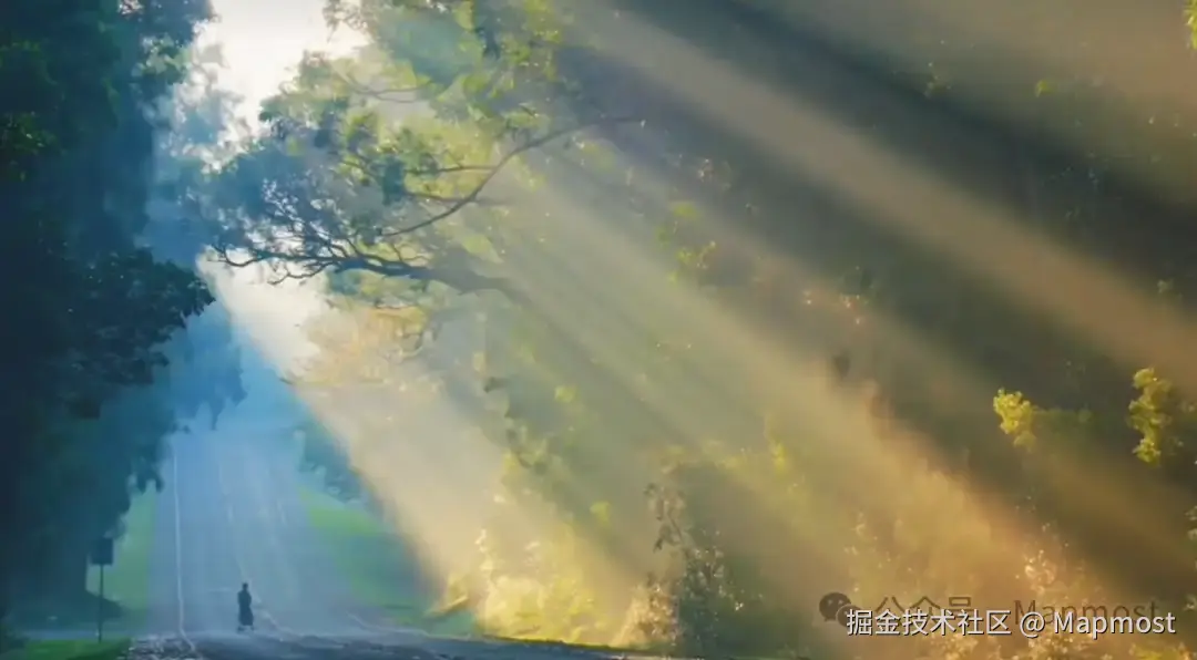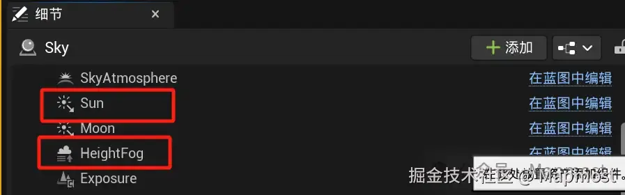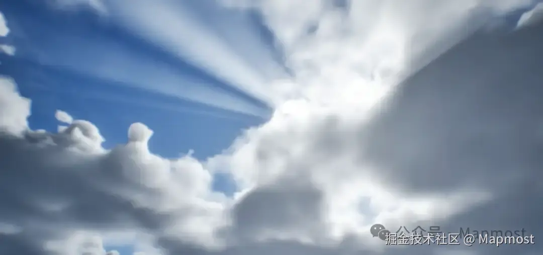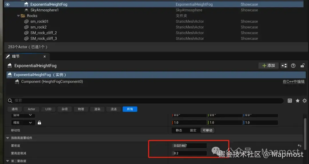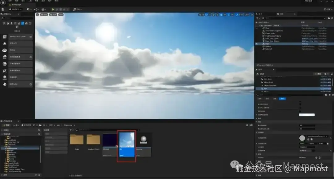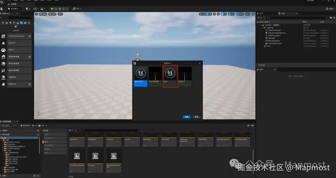 这时场景中是有灯光状态,但是无丁达尔效应,根据文章最开始的分析我们知道丁达尔光线出现的两大因素**:遮挡和空气中的悬浮颗粒**,为了快速实现场景效果,我们可以将场景中的光源删除,从Mapmost for UE中获取天空蓝图,蓝图内包含了定向光源与指数级高度雾且设置了最佳的默认参数。