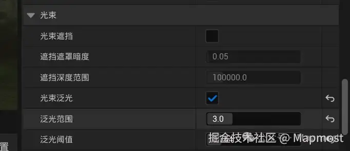 接下来调整sun中的光束泛光范围与泛光阀值即可出现圣光效果。