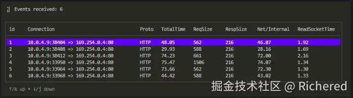 每个请求响应记录会记录在表格中的一行,每列记录这个请求的基本信息。你可以通过方向键或者j/k上下移动来选择记录: