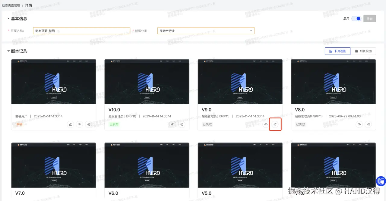 点击卡片上的版本或者图片区域即可进入到版本编辑的页面,可以查看历史版本情况,并且支持选择性的发布历史版本,达到恢复历史版本的回滚效果。