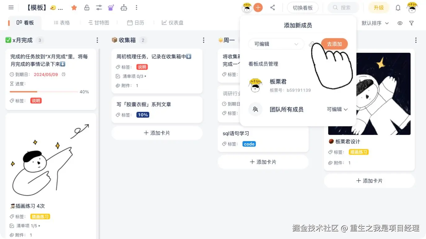 - 看板与列表管理:任务可以被组织到不同的看板和列表中,支持拖拽操作,便于任务的重新排序和分配。