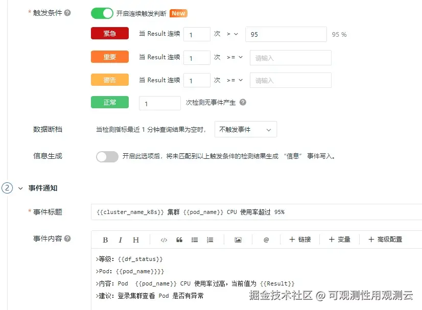 Pod CPU 使用率超过 95%,触发告警。