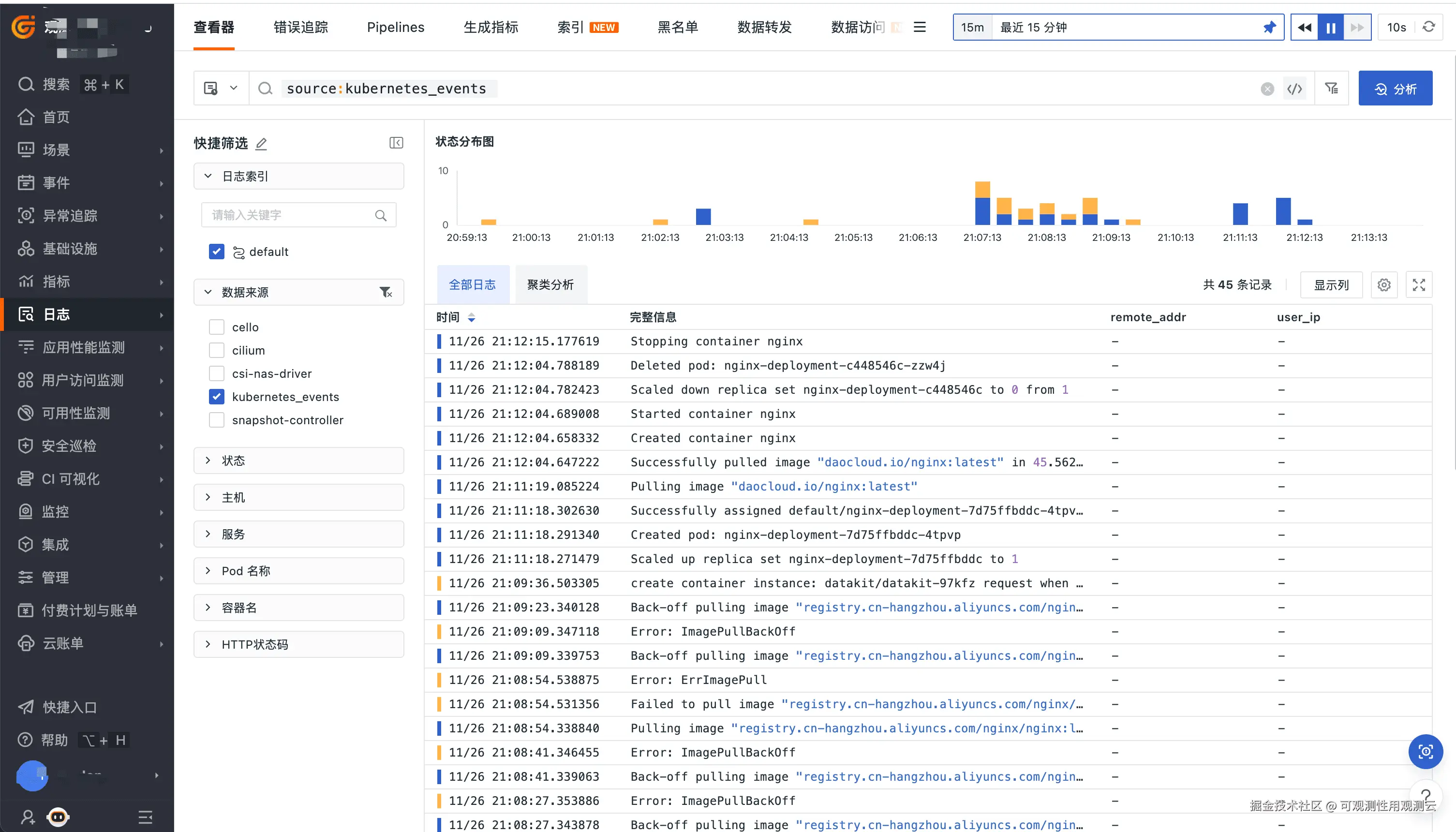 点击「日志」 -「指标管理」,数据来源选择“kubernets_events”。