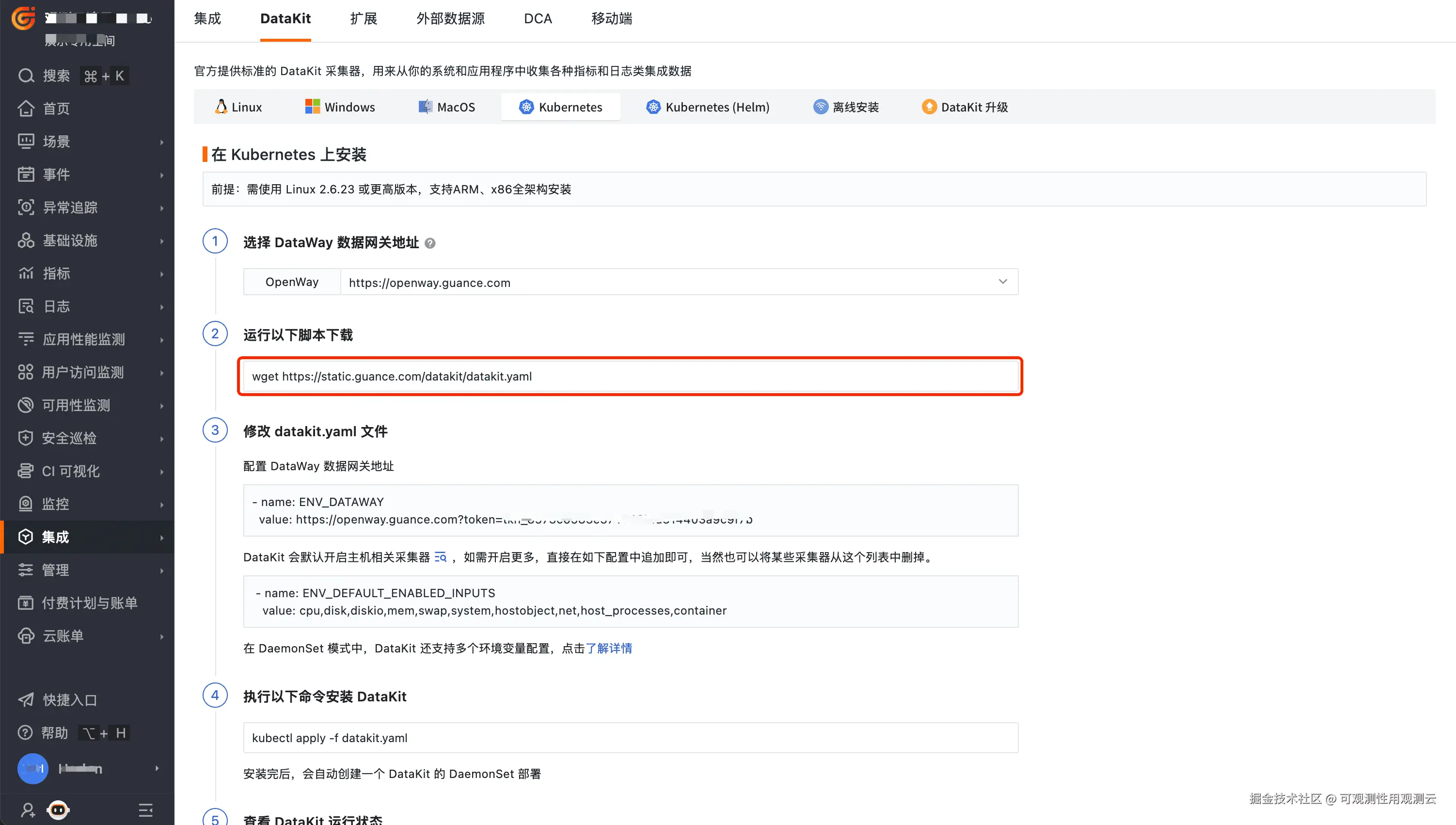 登录观测云控制台,点击「集成」 -「DataKit」 - 「Kubernetes」,下载 datakit.yaml ,拷贝第 3 步中的 token 。