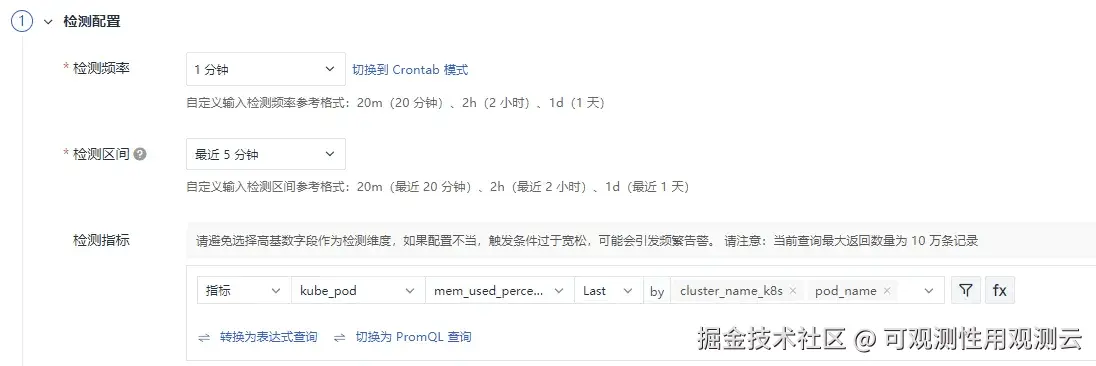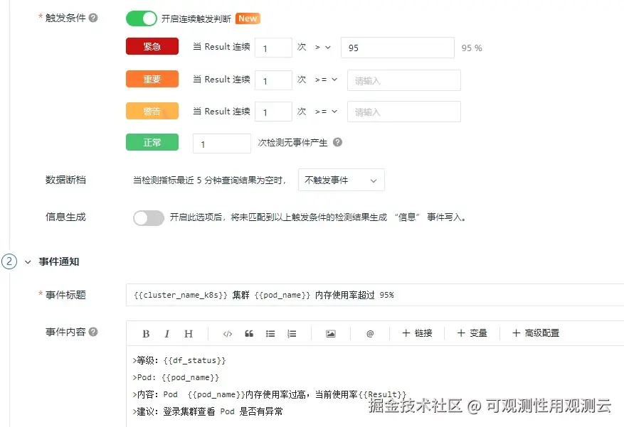 Pod 内存使用率超过 95%,触发告警。
