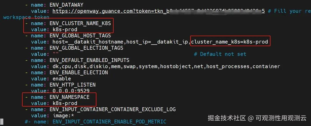 编辑 datakit.yaml ,把 token 粘贴到 ENV_DATAWAY 环境变量值中“token=”后面,设置环境变量 ENV_CLUSTER_NAME_K8S 的值并增加环境变量 ENV_NAMESPACE,这两个环境变量的值一般和集群名称对应,一个工作空间集群名称要唯一。