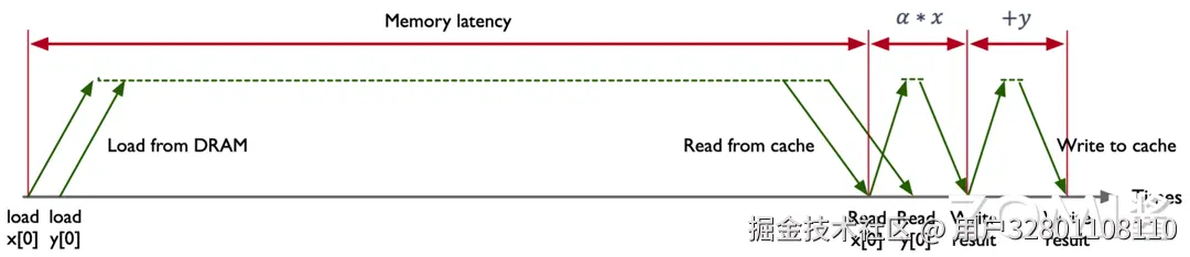Memory latency:图中用红色标注的长箭头表示内存时延,即从开始加载数据到数据被缓存所需的总时间。这是影响计算速度的重要因素。