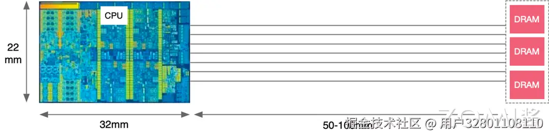假设计算机时钟频率为 3,000,000,000 赫兹(3 GHz),意味着每个时钟周期大约为 1 / 3,000,000,000 秒 ≈ 0.333 纳秒,电信号在导体中的传播速度约为 60,000,000 米/秒,根据上图可知,从芯片到 DRAM 的信号传输距离大约为 50-100 毫米,