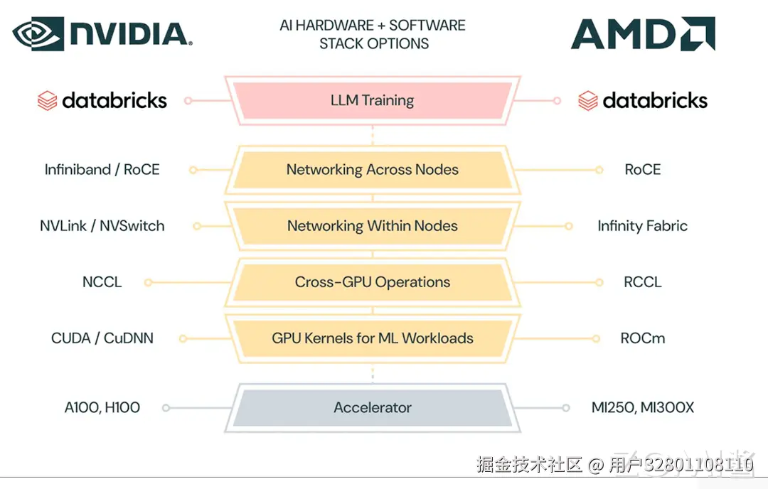 下图分别展示了英伟达和 AMD 的工具链架构,我们可以看到两者的层次架构都是十分相像的,最核心的区别实则在于中间的 libraries 部分,两家供应商均根据自己的硬件为基础 library 做了优化;此外在编译层面两方也会针对自身架构,在比如调度,算子融合等方面实现各自的编译逻辑;而在对外接口上双方都在争取提供给当今热门的框架和应用以足够的支持。