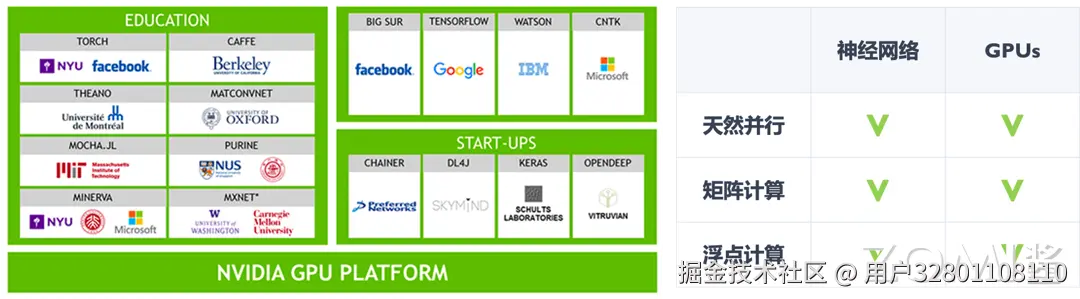 同时,谷歌和吴恩达等团队的工作也进一步强调了 GPU 在 AI 计算中的重要性。谷歌利用 1000 台 CPU 服务器完成了猫狗识别任务,而吴恩达等则只用了 3 台 GTX680-GPU 服务器,取得了同样的成果。这一对比显示了 GPU 在深度学习任务中的显著加速效果,进一步激发了对 GPU 在 AI 领域的广泛应用。