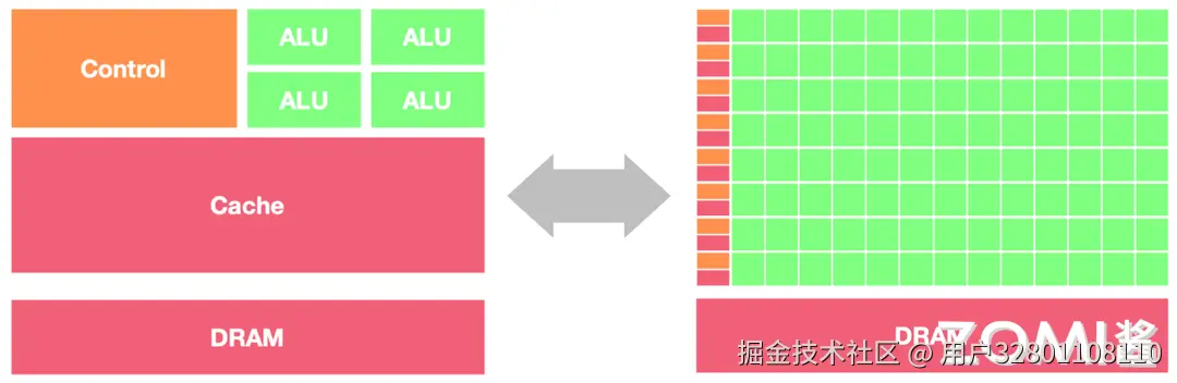 内存架构:CPU 被缓存 Cache 占据了大量空间,大量缓存可以保存之后可能需要访问的数据,可以降低延时; GPU 缓存很少且为线程(Thread)服务,如果很多线程需要访问一个相同的数据,缓存会合并这些访问之后再去访问 DRMA,获取数据之后由 Cache 分发到数据对应的线程。GPU 更多的寄存器可以支持大量 Thread。