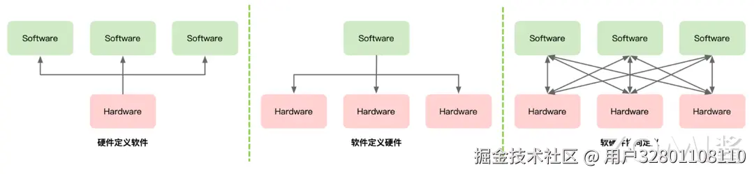 在计算机系统的发展历程中,硬件和软件的关系经历了从"硬件定义软件"到"软件定义硬件"的转变。早期的计算机系统,如早期的操作系统,其系统业务逻辑主要由硬件实现,软件只是起到辅助作用,并且软件的构建依赖于硬件提供的接口。然而,随着计算机技术的不断进步,"软件定义硬件"的概念逐渐兴起。