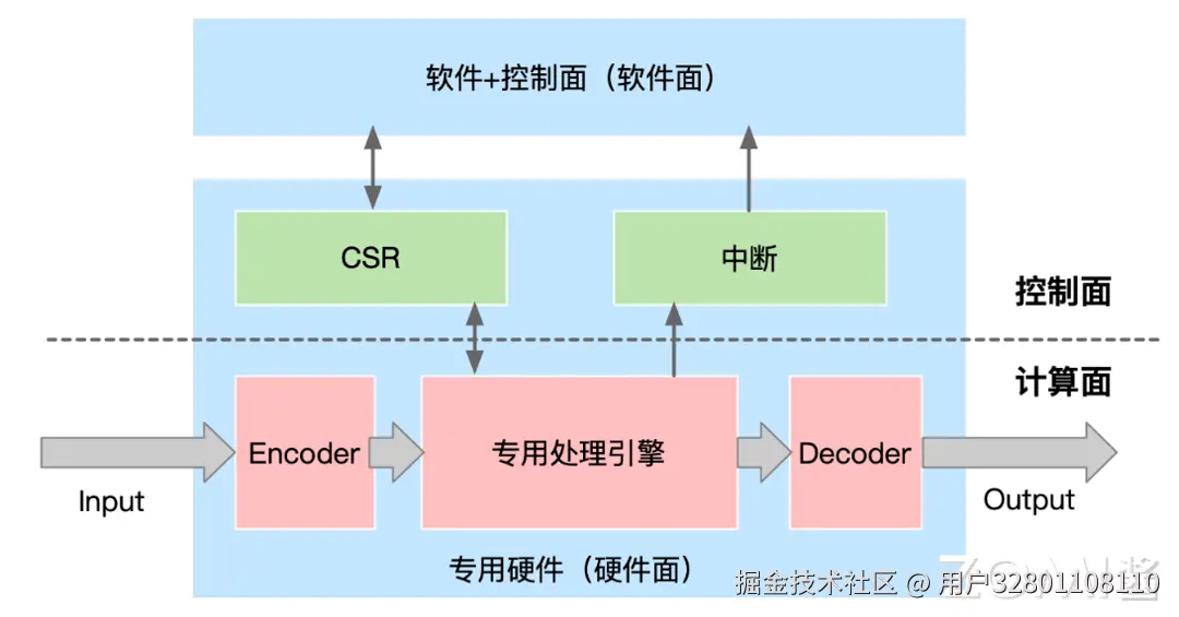 除了 CPU 和 GPU 异构以外,AISC 在异构体系中也扮演着重要的角色(如下图),尤其是对于 AI 加速。其通过驱动程序和 CSR 和可配置表项交互,以此来控制硬件运行。和 GPU 类似,ASIC 的运行依然需要 CPU 的参与: