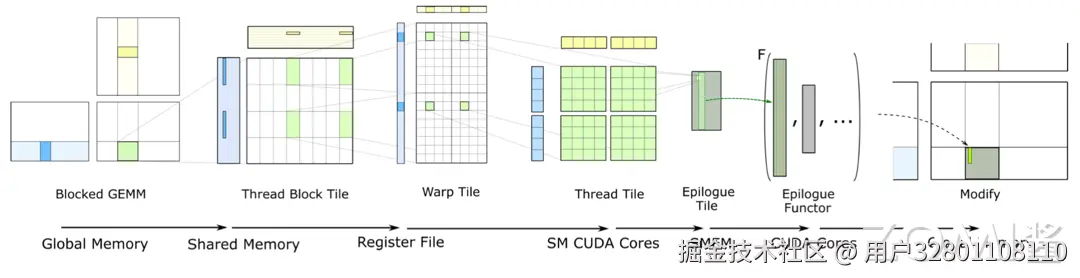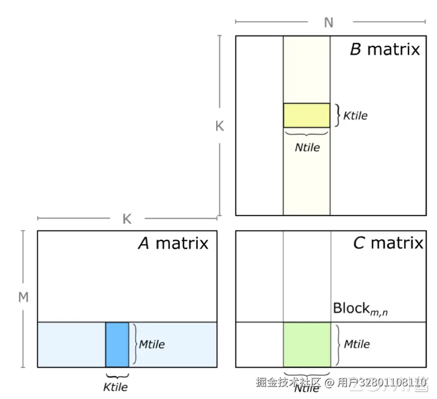 在 GPU 计算时,使用 CUDA kernel grid,将 CUDA 线程块分配给输出矩阵 D 的每个分区,CUDA 线程块并行计算 Mtile-by-Ntile-by-Ktile 矩阵乘,在 K 维上进行迭代,执行累积 Mtile-by-Ntile-by-Ktile 矩阵乘的结果。可以看出这里计算主要是在线程块,也就是 Thread Block,面去进行并行计算的。