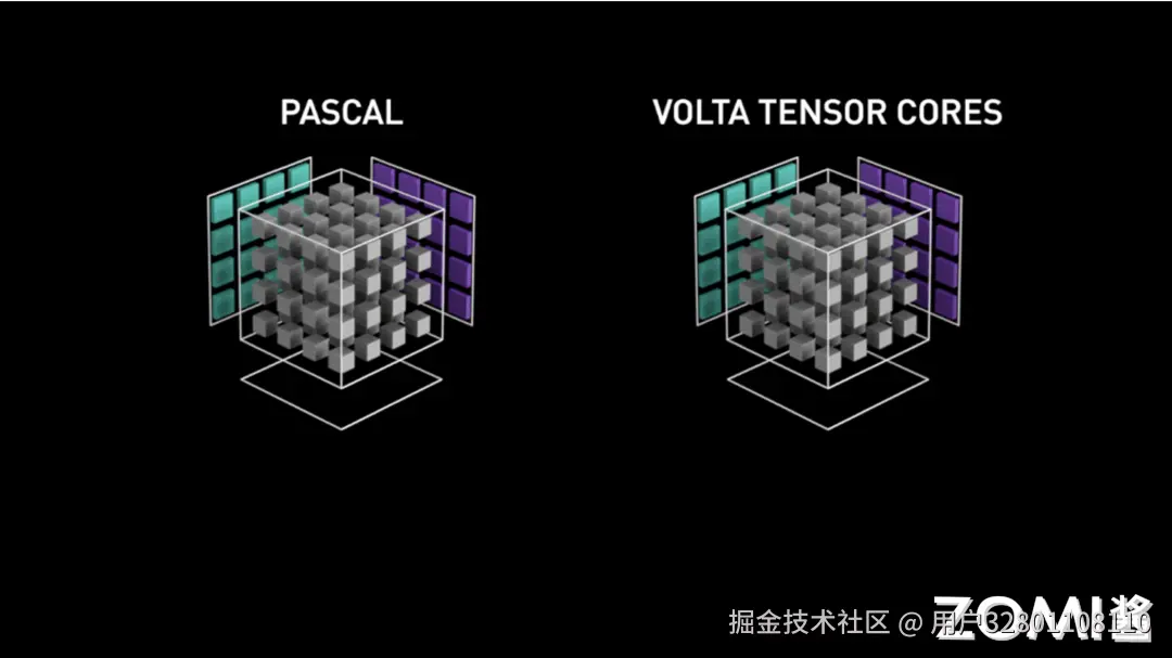如上图所示,左边为没有 Tensor Core 的 Pascal 架构,其运行原理是一个元素跟一行进行相乘,每个时钟周期执行 4 次相乘得到一列的数据。右边则为具有 Tensor Core 的 Volta 的架构,其 Tensor Core 计算的过程是把整个矩阵 A 和矩阵 B 进行相乘然后得到一个矩阵的输出。