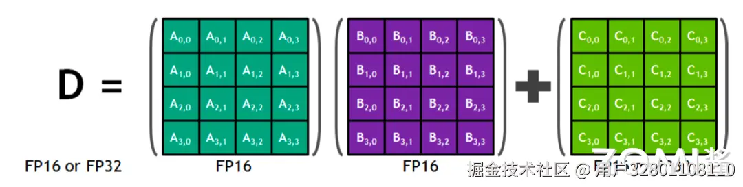 在 Tensor Core 里面并行执行的就是上述的形式,矩阵 A 乘以矩阵 B 等于 C 矩阵这么一个简单最核心操作。