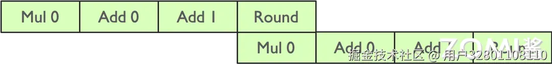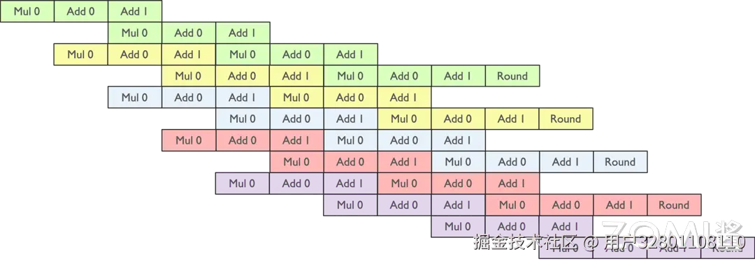 但实际上,Tensor Core 里面的乘法计算只有 Fp16,存储或者加法计算的时候是用到 Fp32 的,于是可以把刚才的一个乘法计算把它节省掉。那么如果实现两个元素相乘,就可以把两条流水并行起来,这个就是指令的流水,如下图所示。