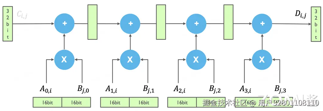 在 Tensor Core 实际计算的时候,实现输出一个元素的计算,即用 A 的一行乘以 B 的一列,就要有四条 Pipeline 的流水线。