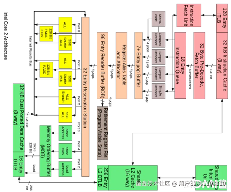 介绍完上述 CPU 的基本组件,我们由浅入深用一张现代 CPU 架构图作为本节内容的结尾。如下图所示的是一张英特尔酷睿 CPU 的架构图,从复杂的控制流程中,我们还是可以清晰的看到 ALU,MU 以及 CU 这些我们刚刚学习过的内容,当然读者朋友要是想设计这么一张架构图还是需要很多的知识储备的。