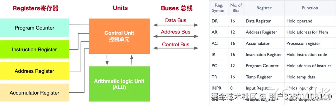 回到 CPU 的的架构,我们需要了解的是 CPU 三大组成的各自分工,控制器和寄存器负责的工作最多、要存的数据最多的两部分。