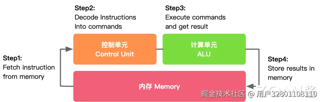 结合下图简单解释,第一步就是从内存里面去读取一些指令,给到控制单元 CU,而控制单元就会对刚才读取的一些指令来进行解码,变成正式的一些 command 命令,然后 ALU 就会去执行这些 command,这些命令执行完之后就会存储回来内存进行汇总也就是写回。