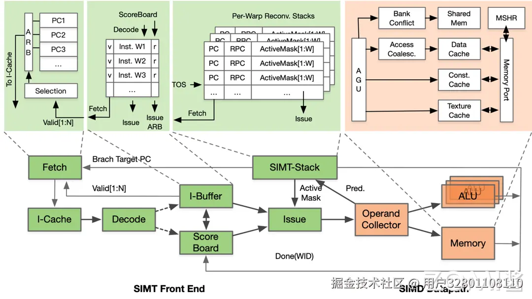 GPU 的 SIMT 可以看作是一个特殊的 SIMD 结构,SIMT 硬件核心流水可以被分为 SIMT 前端(SIMT front-end)和 SIMD 后端(SIMD back-end)。流水线中存在三个调度循环,分别是取指循环、指令发射循环和寄存器访问循环。