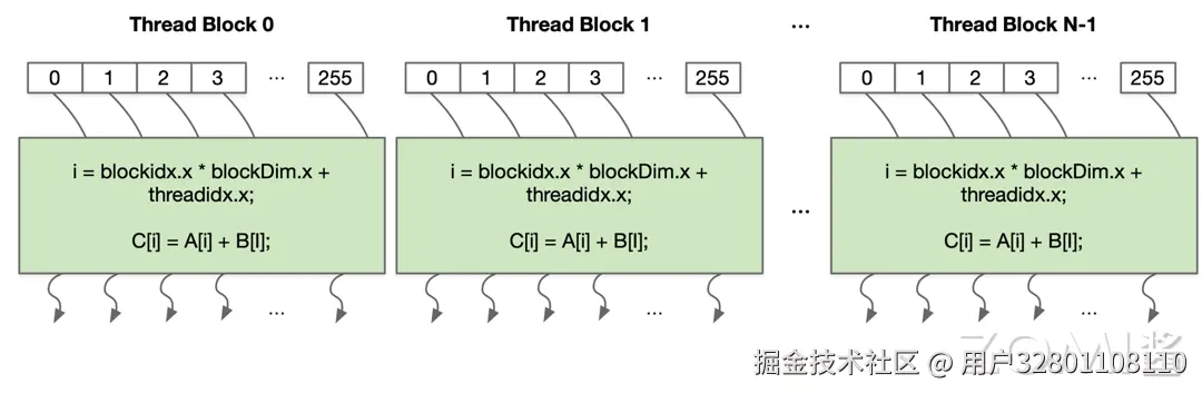 与 SIMD 不同的是,SIMT 允许程序员为独立、标量线程编写线程级的并行代码,还允许为协同线程编写数据并行代码。为了确保正确性,开发者可忽略 SIMT 行为,很少需要维护一个 warp 块内的线程分支,而是通过维护相关代码,即可获得硬件并行带来的显著的性能提升。在一个线程块(Thread Block)中所有线程执行同一段代码,在英伟达 GPU 中这段代码称为 kernel,每一个线程有一个自己的线程索引(threadIdx.x)用于计算内存地址和执行控制决策,每个线程在执行时被分配的唯一标识符,因此可以通过程序来准确控制每一个线程。