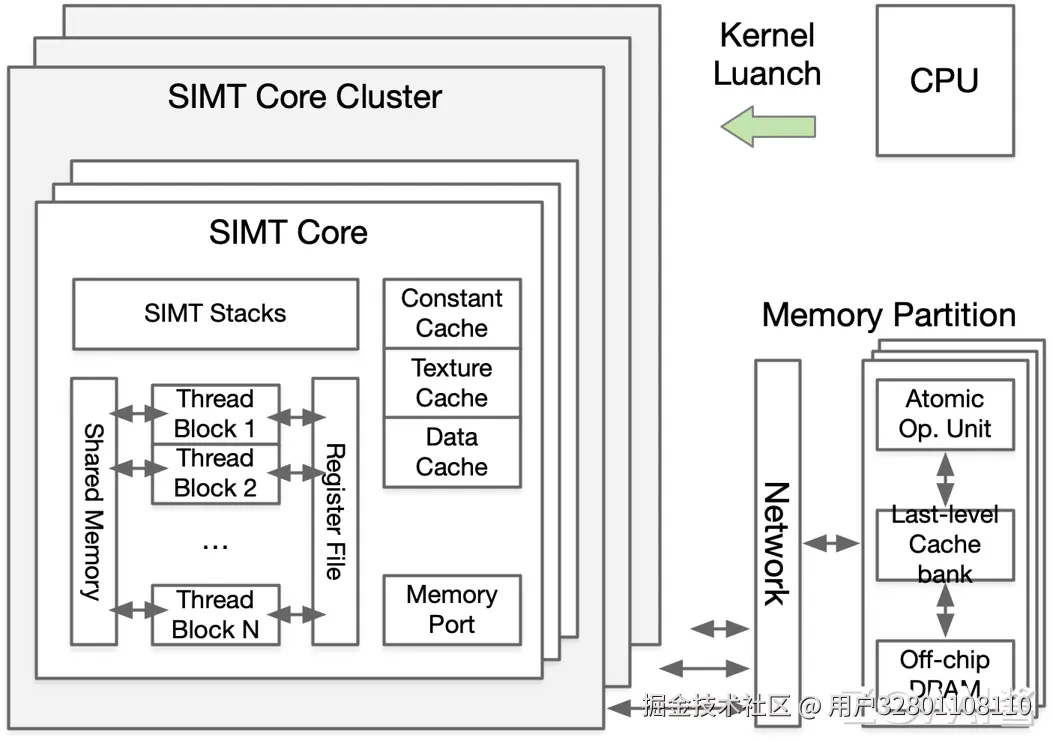 具体到 SIMT 的硬件结构,SIMT 提供一个多核系统(SIMT Core Cluster),CPU 负责将算子( Kernel)加载到 SIMT Core Cluster 中,每个 SIMT 核(SIMT Core)有独立的 RF(Register File)、ALU、Data Cache,但是只有一个指令计数寄存器(Program Counter)和一个指令译码寄存器,指令被同时广播给所有的 SIMT 核,从而执行具体的计算。GPU 则是由多个 SIMT Core Cluster 组成,每个 SIMT Core Cluster 由多个 SIMT Core 构成,SIMT Core 中有多个 Thread Block。