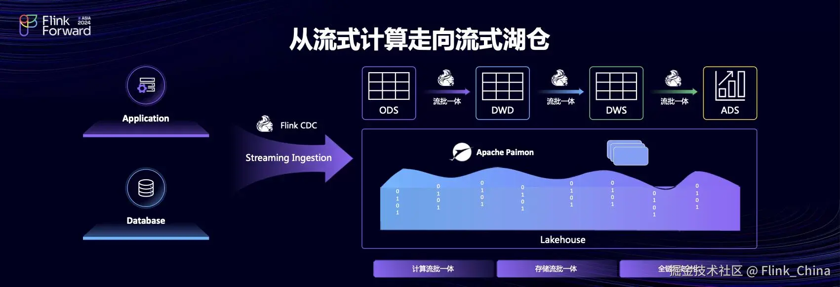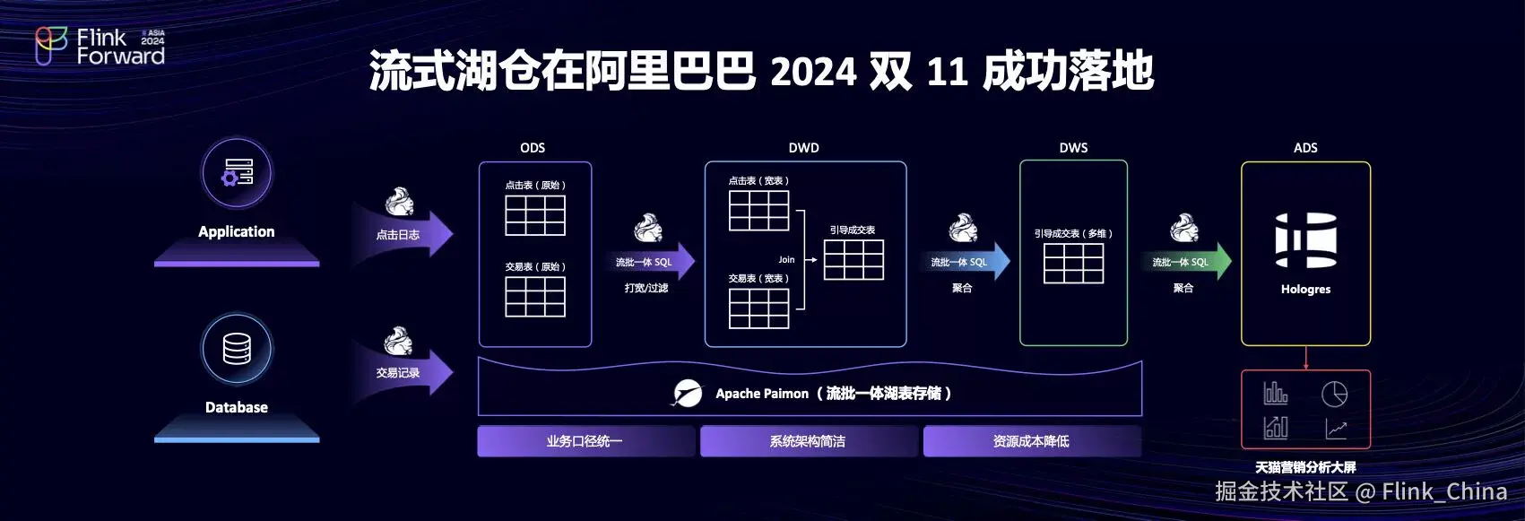 流式湖仓作为一种创新技术架构,引起了业界不少公司的关注,并在 2024 年的多个场景中得到了实际应用。特别是在上个月刚刚结束的阿里巴巴“双十一”活动中,通过采用 Flink+Paimon 这一最新的流式湖仓架构,实现了重要业务场景的成功落地,如天猫营销分析大屏。该案例展示了如何利用统一的技术栈来处理实时与离线数据处理需求,从而保证了数据口径的一致性,并显著降低了存储和计算成本。具体来说,由于采用了同一套架构,避免了重复开发 SQL 逻辑以及双份数据存储的需求,使得整体解决方案更加高效、经济。此外,这种架构还支持运营人员实时查看商品成交来源及流量调配情况,同时允许数据分析师在夜间进行更精确的数据回刷以获取最终结果,比如反作弊信息的更新等。未来,随着更多企业对效率提升及成本控制需求的增长,预计这种新型架构将在更广泛的行业范围内得到推广和应用。