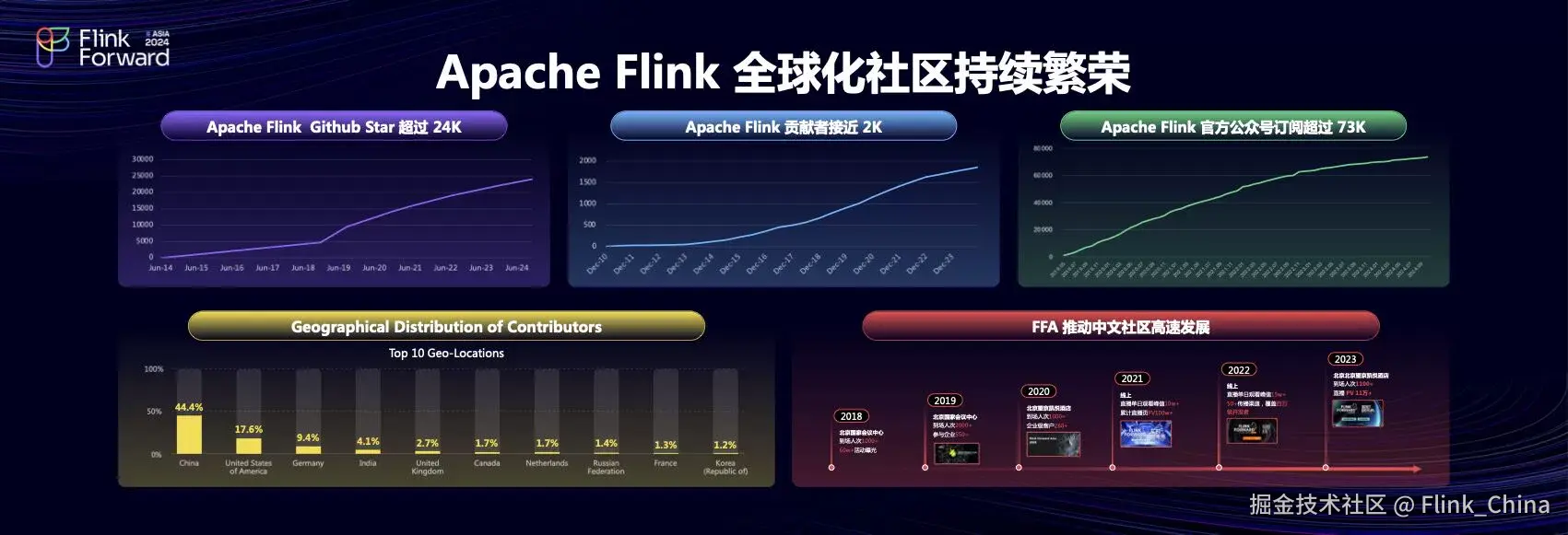 Apache Flink 在过去十年中逐渐成为全球范围内广泛认可的实时流处理框架,得到了工业界和学术界的共同认可。2023 年,Flink 不仅被顶级机构 SIGMOD 授予系统大奖,还见证了多项技术创新,如阿里巴巴捐赠了 Flink CDC(一个实时数据集成框架)给 Flink 社区,并孵化出了新一代实时数据湖 Paimon。至今,Flink 拥有近 2000 位来自世界各地的贡献者,其中约 40%来自中国,显示出中国开发者在该开源项目中的活跃度。阿里巴巴对 Flink 的支持尤为突出,连续七年举办 Flink Forward 大会,促进了技术交流与分享。此外,中国的 Flink PMC 成员及 Flink 开发者们通过微信公众号等平台积极推广 Flink 相关知识和技术文章,极大地推动了 Flink 在中国乃至全球范围内的应用和发展。