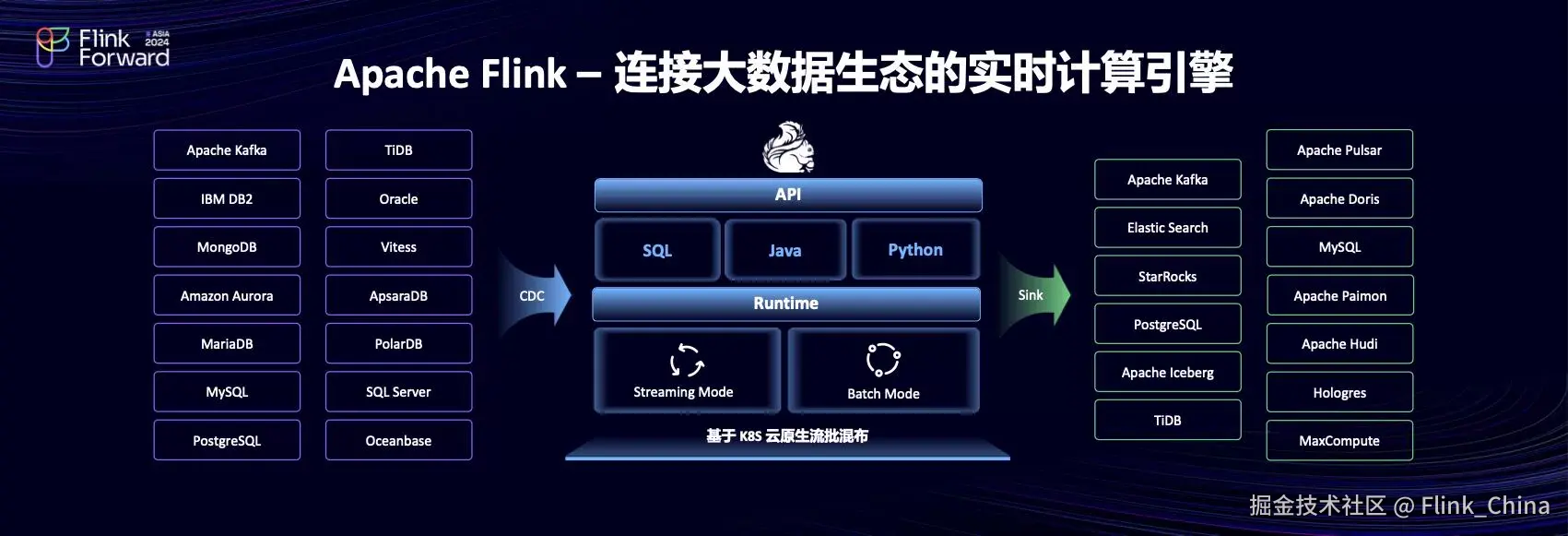 Flink 十年磨一剑,除了阿里巴巴付出非常多的努力来推动它的成长,也离不开中国广大企业、广大开发者的支持,使得 Flink 成为全球范围内大数据流计算的实时标准。其成功不仅源于时代需求,更在于优秀的技术架构设计、扎实理论基础和开放繁荣生态。作为业界首款实现流批融合的计算引擎,Flink 支持Java/SQL/Python 等多语言 API,满足了从大数据开发者到 AI 领域用户的广泛需求。通过丰富的 Connector 和 CDC 子系统,Flink 无缝连接数据库、数据仓库、数据湖等多种存储系统,成为促进不同数据系统间实时流动与分析的关键桥梁,堪称大数据生态中的“数据高速公路”。