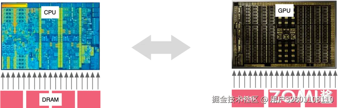 CPU 优化的目标是尽可能快地在尽可能低的延迟下执行完成任务,同时保持在任务之间具体快速切换的能力。它的本质是以序列化的方式处理任务。GPU 的优化则全部都是用于增大吞吐量的,它允许一次将尽可能多的任务推送到 GPU 内部,然后 GPU 通过大数量的 Core 并行处理任务。