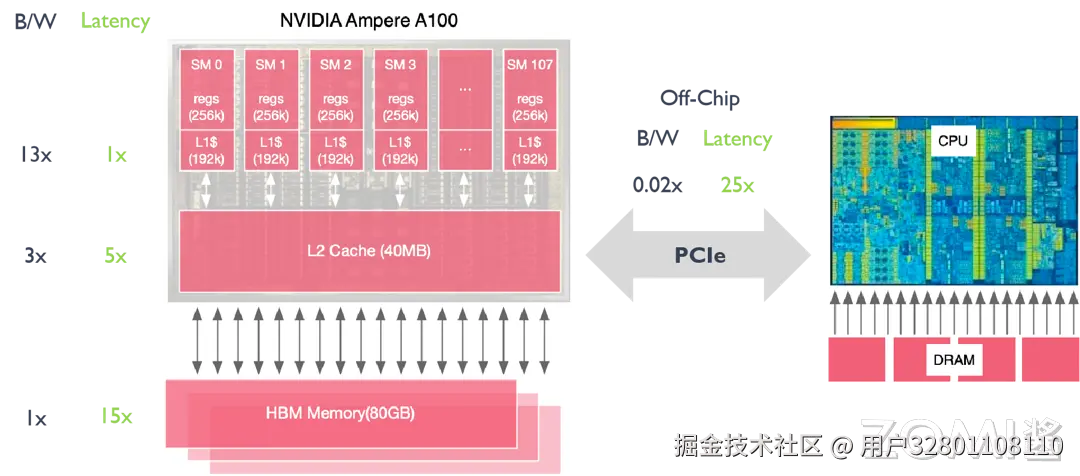 假设使用 CPU 将 DRAM(Dynamic Random Access Memory)中的数据传入到 GPU 中进行计算,较高的时延(25 倍)会导致数据传输的速度远小于计算的速度,因此需要 GPU 有自己的高带宽内存 HBM(High Bandwidth Memory),GPU 和 CPU 之间的通信和数据传输主要通过 PCIe 来进行。