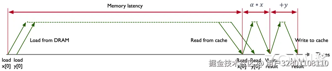 在 O(n) 的时间复杂度下,根据 n 的大小迭代计算 n 次,在 CPU 中串行地按指令顺序去执行 程序。以 Intel Exon 8280 这款芯片为例,其内存带宽是 131 GB/s,内存的延时是 89 ns,这意味着 8280 芯片的峰值算力是在 89 ns 的时间内传输 11659 个字节(byte)数据。 将在 89 ns 的时间内传输 16 字节(C/C++中 double 数据类型所占的内存空间是 8 bytes)数据,此时内存的利用率只有 0.14%(16/11659),存储总线有 99.86% 的时间处于空闲状态。