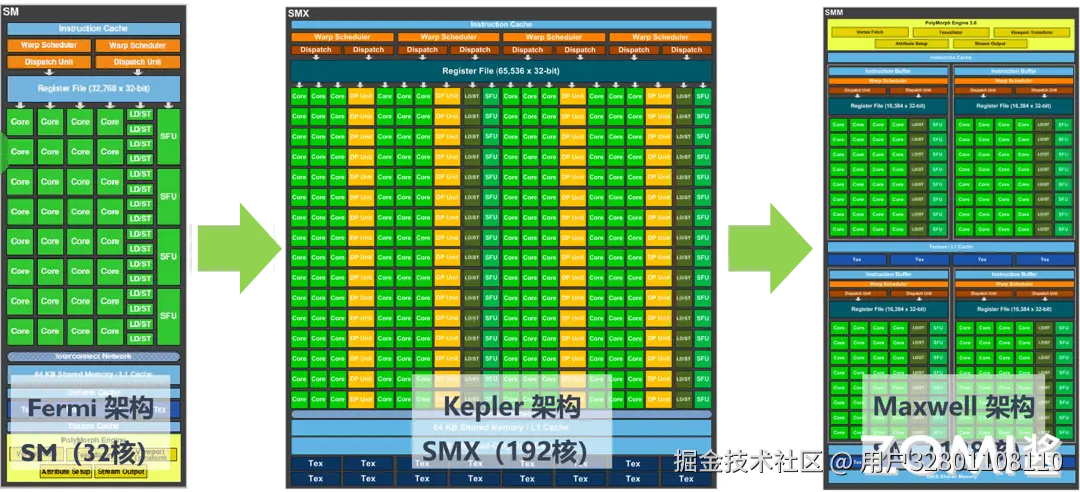开普勒架构相比上一代 Fermi 架构,SM(Streaming Multiprocessor)更名为 SMX,但是本身的概念没有改变,每个 SMX 具有四个 warp 调度器和八个指令调度单元,允许同时发出和执行四个 warp。Fermi 架构共有 32 核,Kepler 架构拥有 192 核,大大提升了 GPU 并行处理的能力。Fermi 支持最大线程数是 1536,Kepler 最大线程数达到 2048。64 个双精度(Double-Precision,DP)单元,32 特殊功能单元(SFU)和 32 个 LD/ST(load/store)单元,满足高性能计算场景的实际需求。