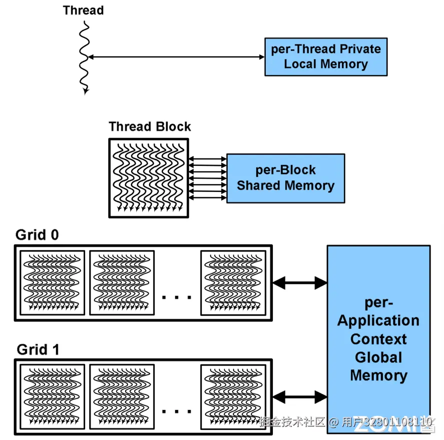 Fermi 架构支持新的并行线程执行 PTX 2.0(Parallel Thread Execution)指令集架构。一个 CUDA 程序被称作并行的 Kernel,线程分为三级,包含线程(Threads)、块(Blocks)和网格(Grid),每个层次结构对应硬件,Thread 可以共享局部内存(Local memory),线程块使用共享内存(Shared Memory),Grid 共享全局内存(Global Memory),具有相应的每个线程专用、每个块共享和每个应用程序全局内存空间。