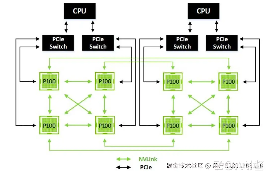 由于多机之间采用 InfiniBand 和 100 GB Ethernet 通信,单个机器内单 GPU 到单机 8 GPU,PCIe 带宽成为瓶颈,因此 Pascal 架构首次提出 NVLink,针对多 GPU 和 GPU-to-CPU 实现高带宽连接。NVLink 用以单机内多 GPU 内的点对点通信,带宽达到 160 GB/s,大约是 PCIe 3x16 的 5 倍,减少数据传输的延迟,避免大量数据通过 PCIe 回传到 CPU 的内存中,导致数据重复搬运,实现 GPU 整个网络的拓扑互联。在实际训练大模型的过程中,带宽会成为分布式训练系统的主要瓶颈,从而使得 NVLink 成为一项具有重要意义的创新。