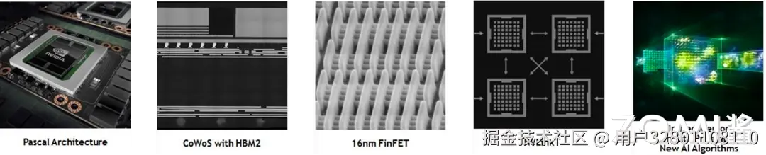 2016 年英伟达提出 Pascal 架构,相比之前的架构,Pascal 帕斯卡架构在应用场景、内存带宽和制程工艺等多个方面做出了创新。将系统内存 GDDR5 换成 HBM2,能够在更高的带宽下处理更大的工作数据集,提高效率和计算吞吐量,并减少从系统内存传输的频率,而且 HBM2 原生支持数据纠错(Error correcting Code, ECC)。采用 16nm FinFET 工艺,拥有 15.3 亿个晶体管,相同功耗下算力提升提升一个数量级。同时提出第一代 NVLink,提升单机卡间通信之外扩展多机之间的带宽。支持统一内存,允许在 GPU 和 CPU 的完整虚拟地址空间之间透明迁移数据,降低了并行编程的门槛。支持计算抢占和针对 Pascal 架构优化的 AI 算法,可应用于高性能计算、深度学习和 GPU 计算密集型领域。