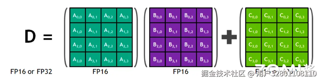 英伟达计算硬件模型从 SIMT 发展成为了 SIMT+DSA 的混合,每个张量核心单时钟周期内执行 64 个浮点 FMA 操作,而 SM 中的 8 个张量核心单时钟周期总共执行 512 个 FMA 操作(或 1024 个单独的浮点操作)。每个张量核心在一个 4x4 矩阵上操作,并执行计算:,输入 A 和 B 矩阵是 FP16,而计算结果矩阵 C 和 D 可以是 FP16 或 FP32 矩阵,极大地减少了系统内存的开销,一个时钟周期内可以执行更多的矩阵运算,使得 GPU 在能耗上更有优势。CUDA 9 C++ API 有专门的矩阵乘和存储操作,有效地使用 CUDA-C++程序中的张量核心,同时 cuBLAS 和 cuDNN 库利用张量核进行深度学习研究。