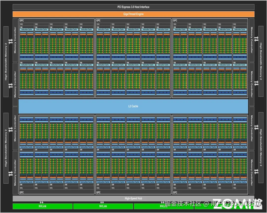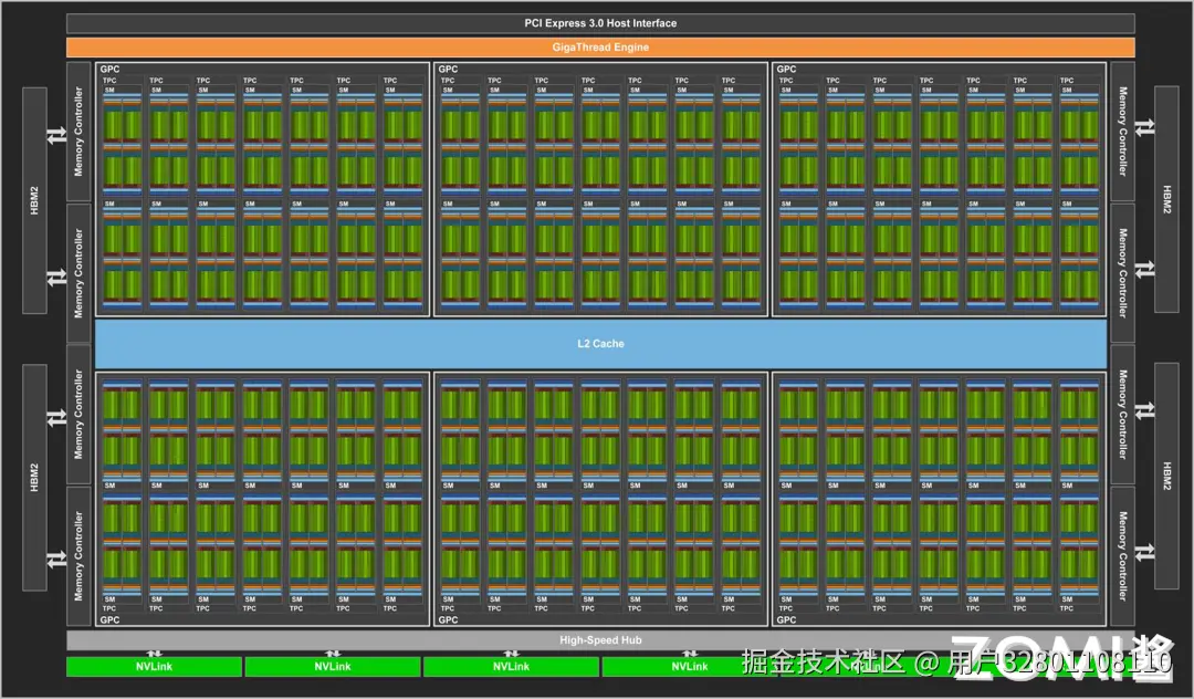 与上一代 Pascal GP100 GPU 一样,GV100 GPU 有 6 个 GPU 处理集群(GPCs),每个 GPC 有 7 个纹理处理集群(TPCs)、14 个流式多处理器(SMs),以及内存控制器。