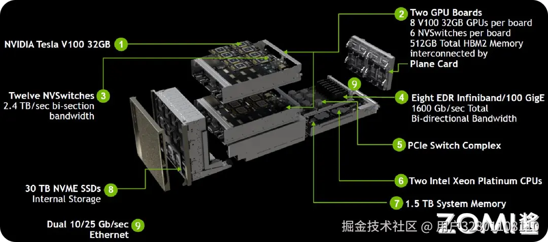 此外,NVSwitch1.0 技术是 Volta 架构中的一项重要创新,旨在提高 GPU 之间的通信效率和性能。NVSwitch1.0 可以支持多达 16 个 GPU 之间的通信,可以实现 GPU 之间的高速数据传输,提高系统的整体性能和效率,适用于需要大规模并行计算的场景,比如人工智能训练和科学计算等领域。