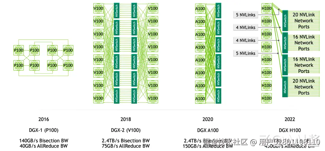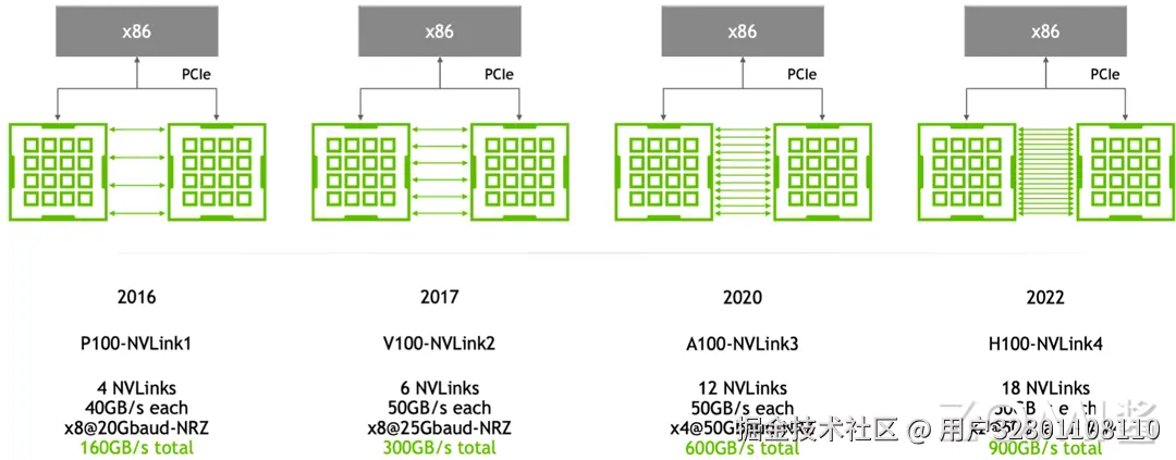 此外,由于单个 GPU 工作线程的内存有限,并且许多大模型的大小已经超出了单个 GPU 的范围。所以就需要实现跨多个 GPU 的模型训练,这种训练方式就涉及到了分布式通信和 NVLink。当谈及分布式通信和 NVLink 时,我们进入了一个引人入胜且不断演进的技术领域,本节我们将简单介绍分布式通信的原理和实现高效分布式通信背后的技术 NVLink 的演进。