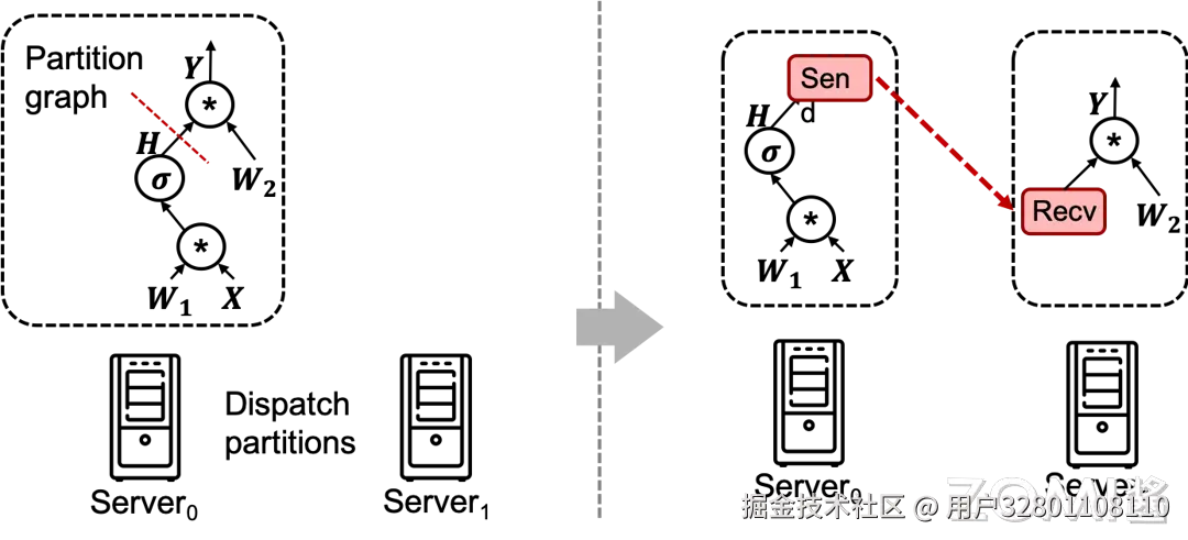 如上图所示,在 AI 计算框架中,我们需要将原来的一个网络模型进行切分,将其分布在不同的机器上进行计算,这里通过在模型中插入 Send 和 Recv 节点来进行通信。